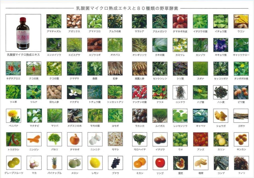 ハサル農場で無農薬栽培された80種類の果物や薬草・野草を発酵し、つくられた補酵素を含有する酵素乳酸菌原液。